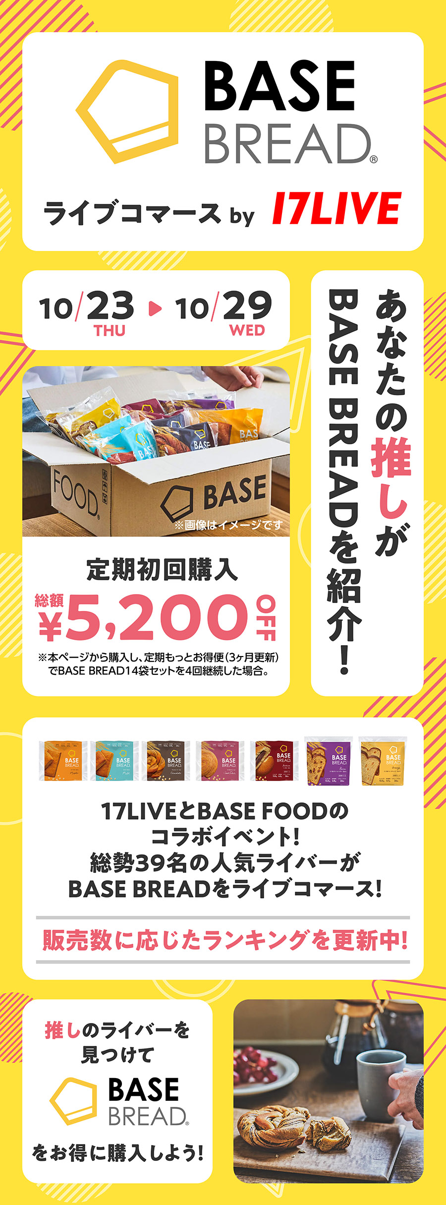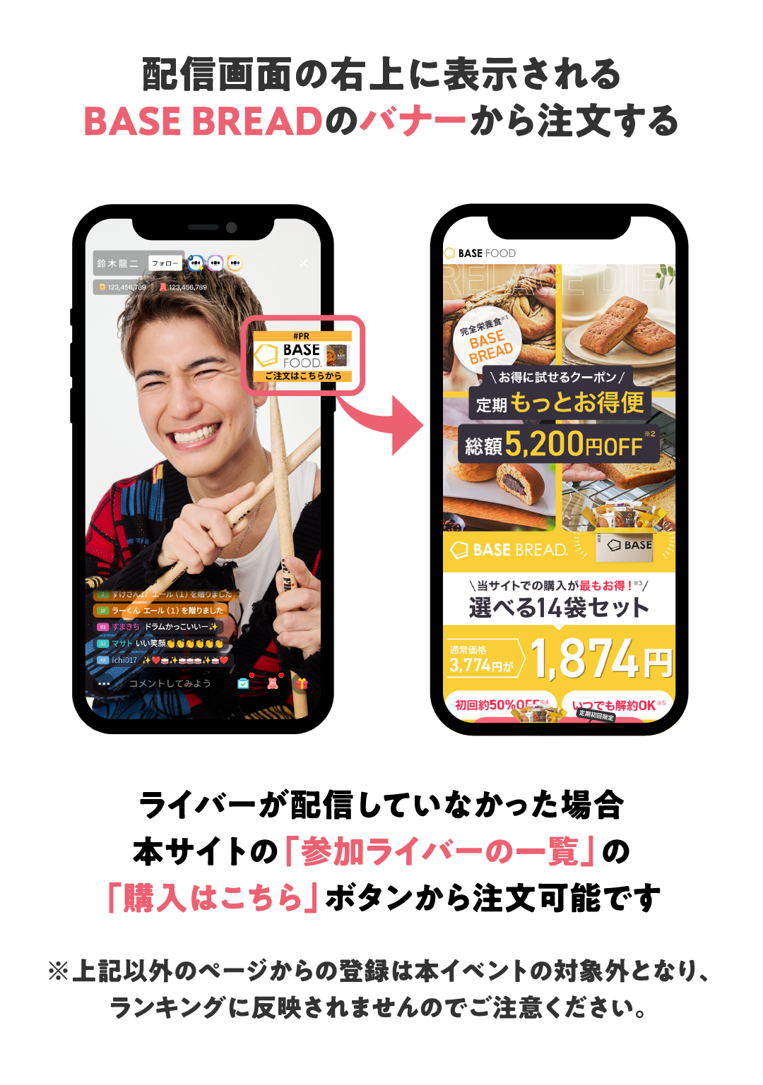 - ●ライブ配信画面上に表示される「BASE BREADのバナー」から購入ページに遷移し、購入手続きを行ってください。もしくは本キャンペーンページ内「購入はこちら」からも購入ページへ遷移可能です。