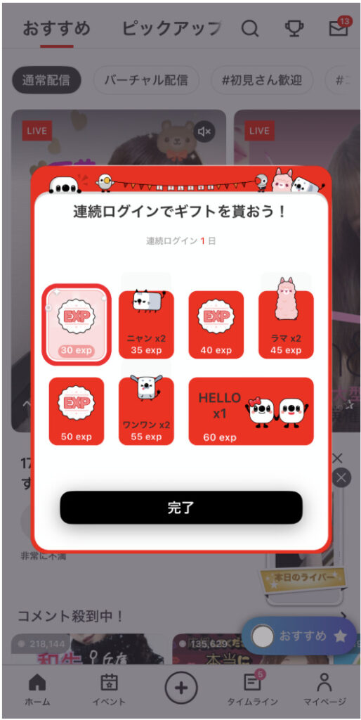 17LIVEアプリに毎日ログインをすると連続日数がカウントされ、連続ログイン日数に応じたログインボーナスを獲得することができます。
