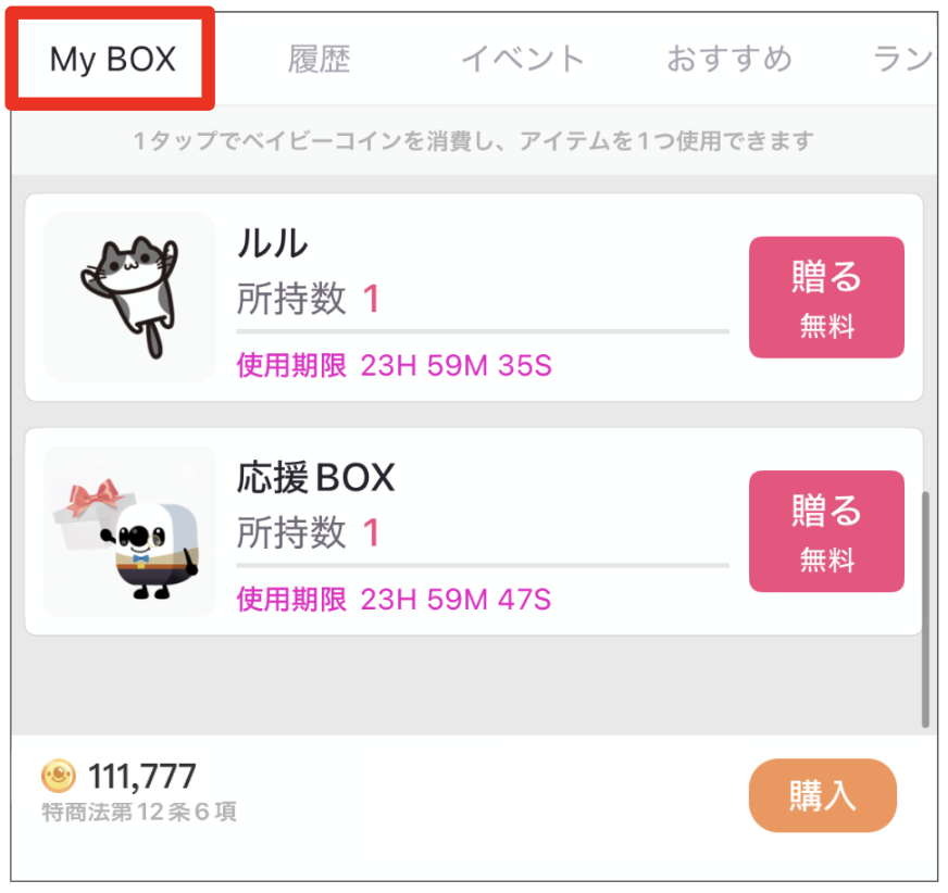 ログインボーナスで獲得した無料ギフトは、配信画面のギフトBOX内「My BOX」からご利用いただけます。