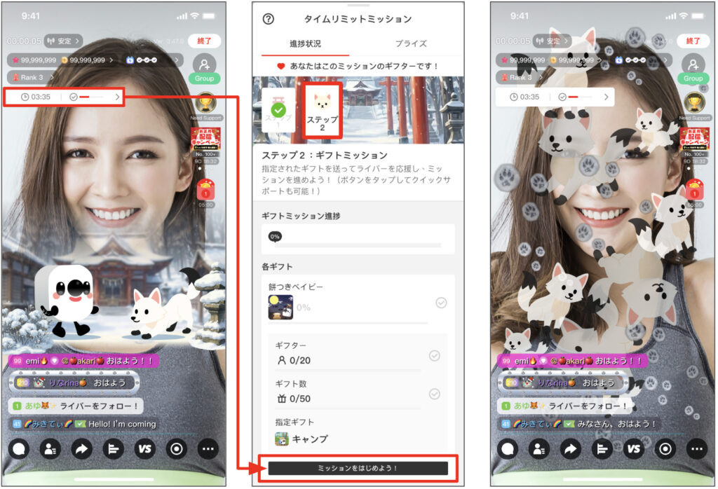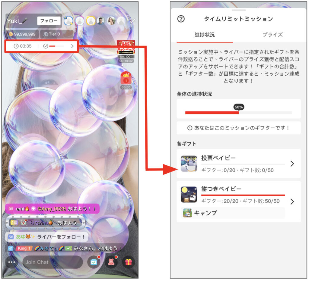 ※ミッション中の配信画面左上のタイムゲージ(進捗バー)をタップ→「プライズ」タブをタップすると、達成時に獲得できるプライズを確認できます。