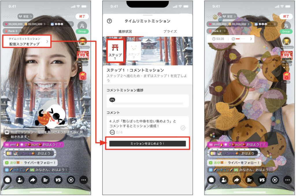 ・参加方法:進捗バー内の「ミッションを始めよう!」ボタンをタップしてください。 コメント欄に正しいキーワードが自動入力され、コメントを送るごとに画面上のエフェクトが解除(または物語が進行)されていきます。
