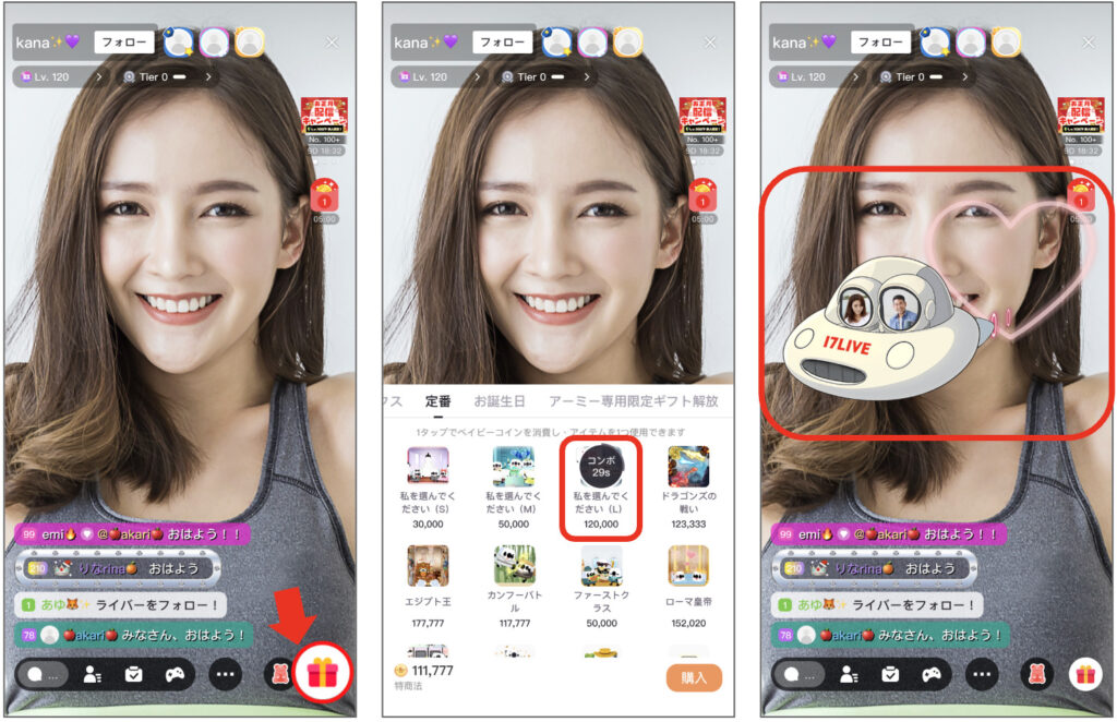 ライブ配信画面下部のギフトボックスをタップし、該当ギフトを贈ると、ライバーとリスナーのプロフィールアイコンが一緒にアニメーションで表示されます。