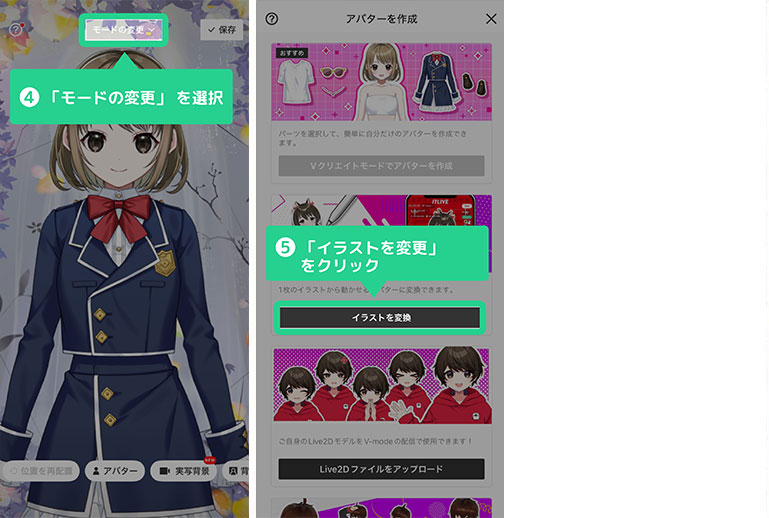 「イラストVモード」はスマホアプリからのみ配信可能です(ブラウザ版ではご利用いただけません)。