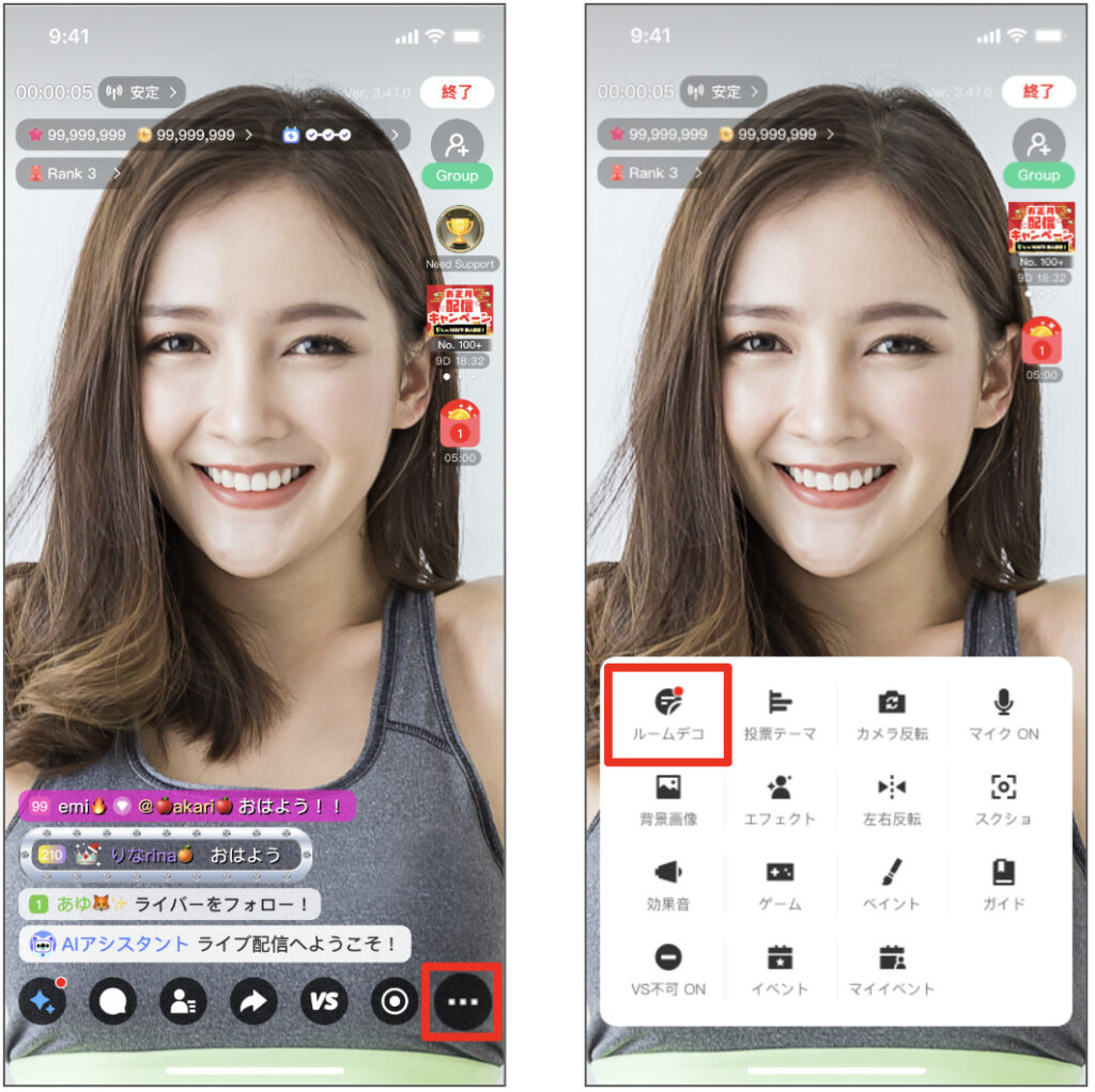 ボタンをタップし、「ルームデコ」を選択します。