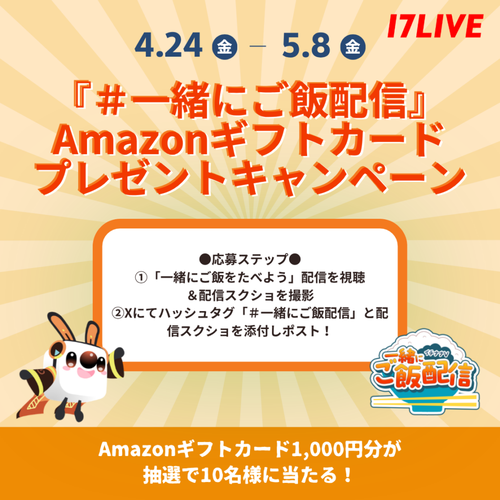 - 本キャンペーンは、17LIVE株式会社(以下「当社」といいます)が主催・運営しております。Amazon.com, Inc 及びこのグループ会社その他の企業は、本キャンペーンにおいて、一切の支援・承認・運営などを行っておりません。なお、「Amazon」はAmazon.com, Inc の登録商標であり、法律で保護されています。