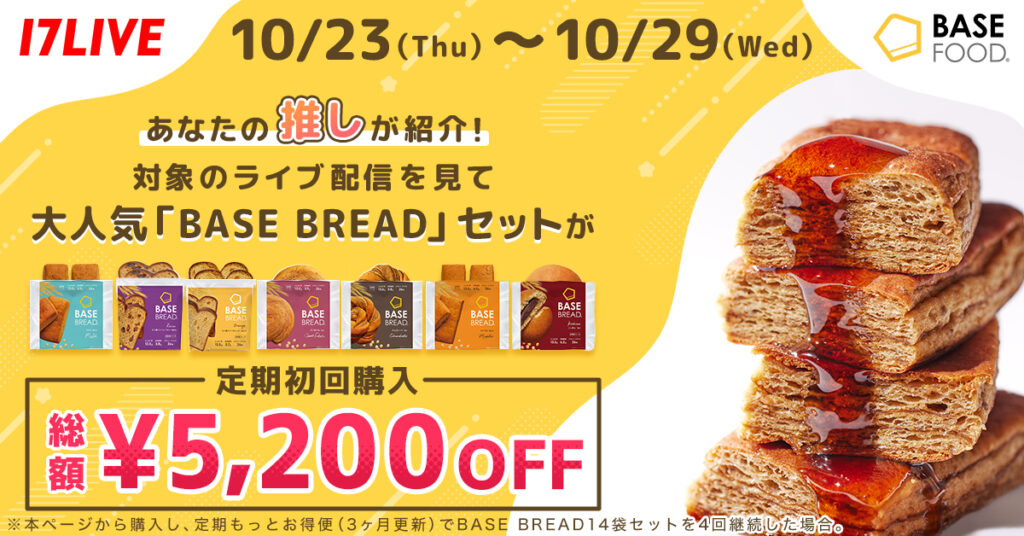 本イベントでは、「17LIVE」で活躍する39名のイチナナライバー(ライブ配信者)が、1食で1日に必要な栄養素の3分の1が摂れる(※1)「BASE BREAD(ベースブレッド)」の定期初回限定セットをライブ配信でリアルタイムに紹介し、販売の促進を行います。対象のライバーが指定するページから定期もっとお得便(3ヶ月更新)で「BASE BREAD14袋セット」を購入し、4回継続いただいた場合、総額で5,200円オフ(※2)の価格でお買い求めいただけます。