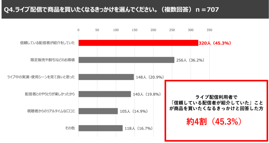 〜ライブ配信での購買のきっかけや購買意欲に関する質問では、「正直なレビュー」や「信頼している配信者」が上位に〜