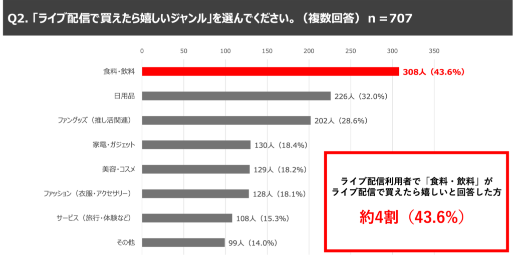 全ての対象者に、ライブ配信で買えたら嬉しいジャンルに関する質問をしたところ、約4割(43.6%)の方が「食品・飲料」を購入したいと回答し、さらにどのタイミングで購入したいかの質問では、半数以上(52.9%)の方が「セールやキャンペーンの時」と回答。国内の食料品高騰や物価高の影響からか、ライブ配信においても食料品をお得なタイミングで購入したいと考えている方が多いことが分かりました。