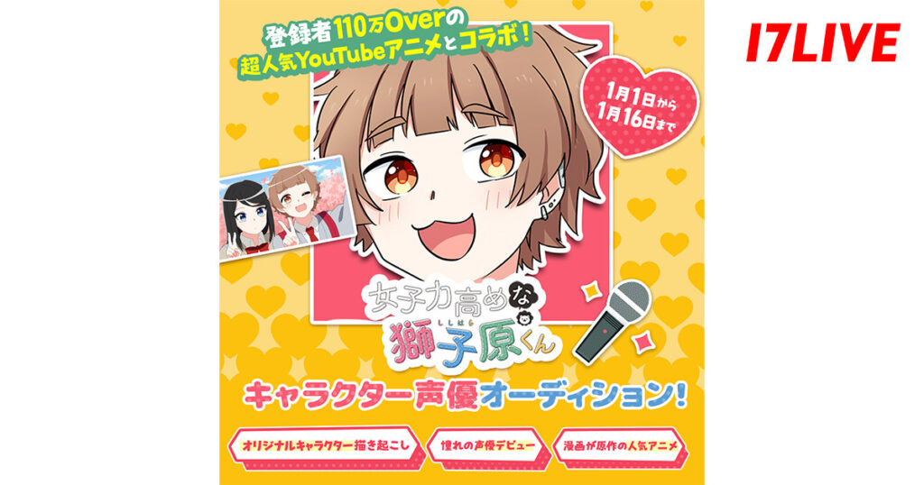 17LIVE株式会社(東京都渋谷区、代表取締役:ジャン・ホンフイ、URL:https://jp.17.live/)が運営する日本最大級のライブ配信アプリ「17LIVE(イチナナ)」は、チャンネル登録者数が110万を超える大人気YouTubeアニメ、『女子力高めな獅子原くん』へ声優として出演するライバーを決定するオーディションイベント「“登録者110万Over”の超人気YouTubeアニメとコラボ!『女子力高めな獅子原くん』キャラクター声優オーディション」を、2026年1月1日(木)より開催することが決定しましたので、お知らせいたします。