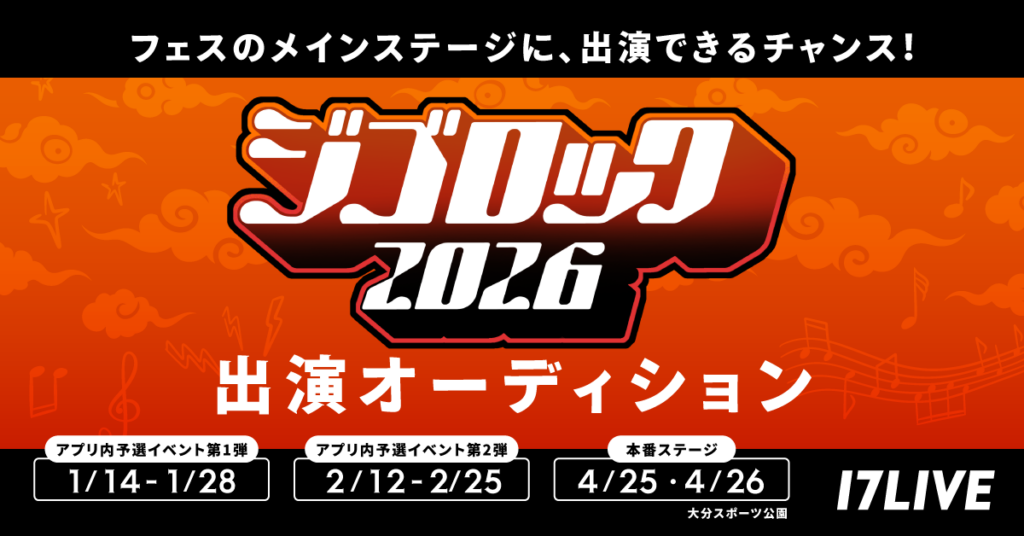 17LIVE株式会社(東京都渋谷区、代表取締役:ジャン・ホンフイ、URL:https://jp.17.live/)が運営する日本最大級のライブ配信アプリ「17LIVE(イチナナ)」は、大分県で2026年4月25日(土)、26日(日)の2日間にわたって開催される大型音楽フェスティバル『ジゴロック2026 supported by ニカソー』への出演者を選出する、「『ジゴロック2026』出演オーディション」を、2026年1月14日(水)より開催することが決定しましたので、お知らせいたします。