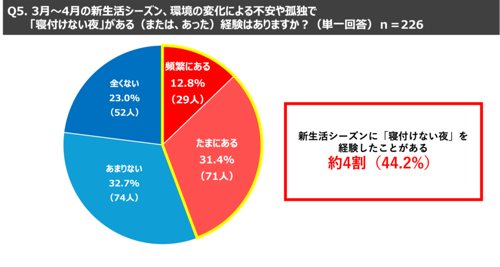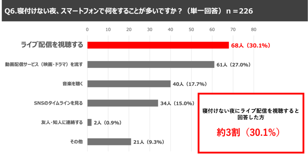 職業で会社員と回答した226名を対象に、新生活シーズンの夜に関する質問をしたところ、4割以上(44.2%)の方が新生活シーズンに「寝付けない夜」があると回答し、さらに寝付けない夜のスマホ行動に関する質問では、約3割(30.1%)の方が「ライブ配信の視聴」と回答し、映画やドラマなどの動画配信サービス視聴(27.0%)を上回るという結果となりました。孤独感を感じやすいと言われる新生活シーズンのひとり時間においては、一人だけで楽しむ動画配信サービスよりも、双方向のコミュニケーションを楽しむことができるライブ配信が求められているのではないかと考えられます。