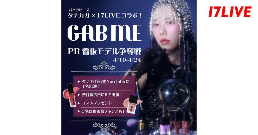 17LIVE株式会社(東京都渋谷区、代表取締役:ジャン・ホンフイ、URL:https://jp.17.live/)が運営する日本最大級のライブ配信アプリ「17LIVE(イチナナ)」は、幅広い場所で活躍中のYouTuber「パパラピーズ」「タナカガ」と初のコラボレーションとして、「タナカガ」がプロデュースするコスメライン「GAB ME(ガブミー)」のPRモデルを選出するオーディションイベント、「パパラピーズタナカガ×17LIVEコラボ!コスメ『GABME』PR看板モデル争奪戦」を、2026年4月10日(金)より開催することが決定しましたので、お知らせいたします。