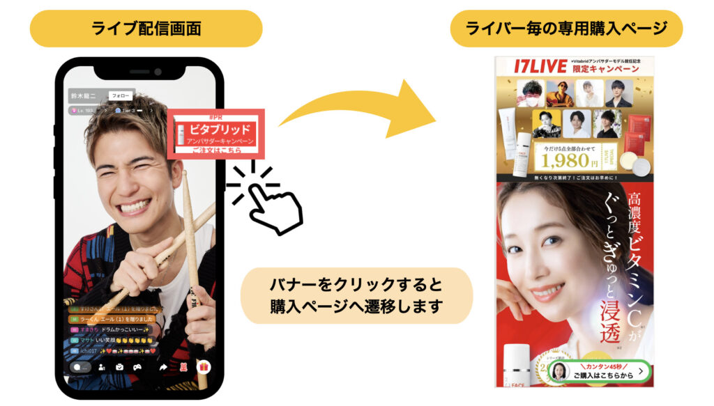 対象ライバーのライブコマース配信を視聴し、 ライブ配信画面内右上に設置された「ビタブリッドアンバサダーキャンペーンバナー」をタップ、もしくはライバーの告知投稿内の購入リンクより商品をお買い求めいただけます✨